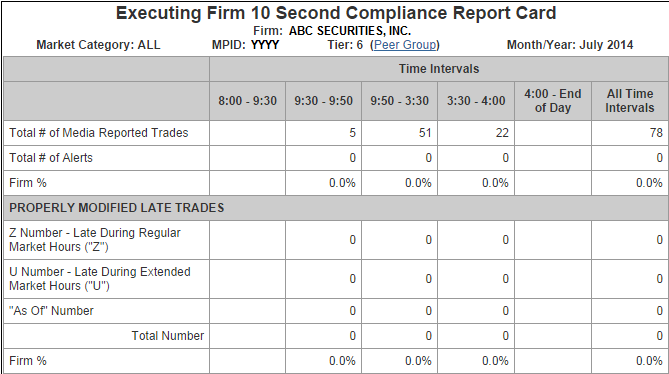 The Executing Firm 10 Second Compliance Report Card is a monthly status report for trades that another firm reported on behalf of the market participant. The report contains counts of properly modified late trades, late trades that were not modified, and improperly modified trades.