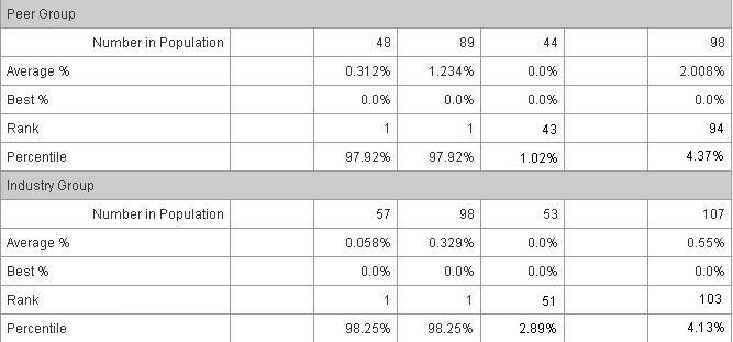 This is the best (lowest) percentage of late trades that were not modified with the required corresponding modifier to the total executing firm media reported trades among the firms in the selected MP's peer group for the selected month and year in a given time interval.