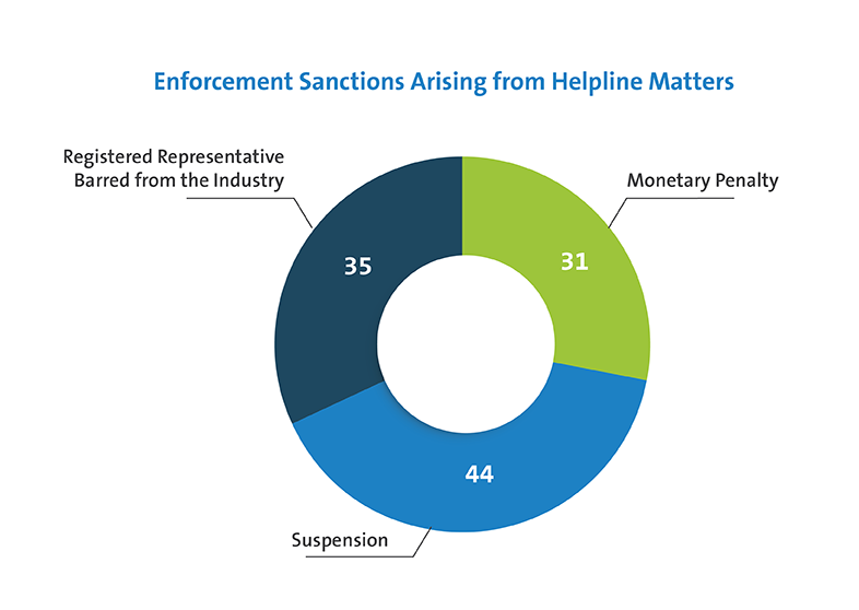 Calls to the Helpline have led to FINRA imposing sanctions – including bars, monetary penalties and suspensions – on firms and registered representatives found to have engaged in misconduct relating to senior investors.